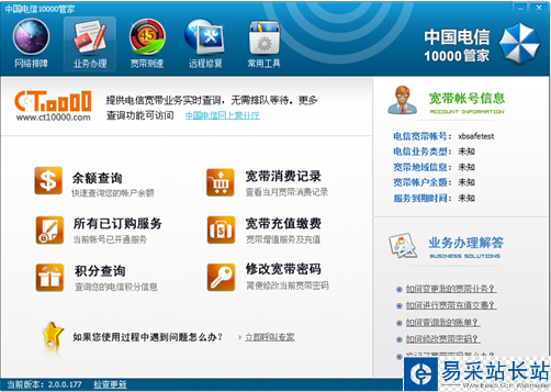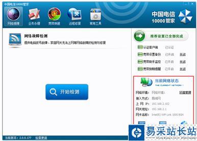 中國電信10000管家包含網絡排障、推薦設置、網絡狀態、業務辦理、寬帶測速、專家遠程服務、常用工具、升級等功能,具體如下:
