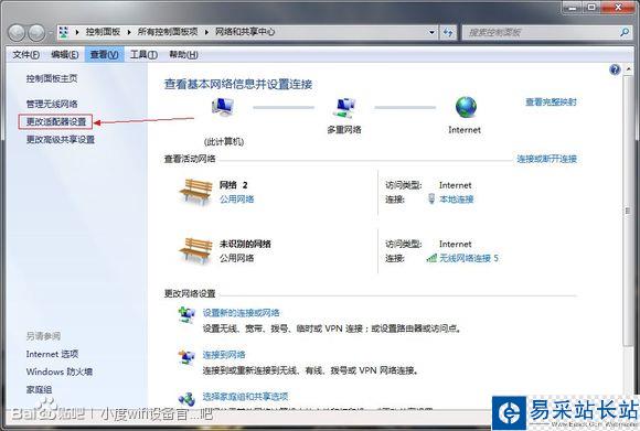 2.在彈出的網(wǎng)絡(luò)共享中心頁面中選擇左側(cè)的“更改適配器設(shè)置”。