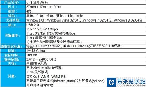 一些參數(shù)羅列后,懂的無線網(wǎng)絡(luò)的同學一眼就能看明白,不懂的還是有些發(fā)懵,這么多的參數(shù)都是干什么的?簡單的說,這個小米隨身Wi-Fi支持除Windows 8.1系統(tǒng)外的任何主流系統(tǒng)(Macbook系列不兼容。),支持基礎(chǔ)的2.4G Wi-Fi,擁有13個無線通信信道(可以理解為馬路的寬闊程度),最快傳輸速率可達到150Mbps(與最普通的路由器相同),支持USB 2.0接口(2000年后的電腦一般都能插),內(nèi)置的PIFA天線。這些信息基本上與之前小度、360隨身Wi-Fi相同,但小米似乎多了一個低功耗及電源管理的新特性。