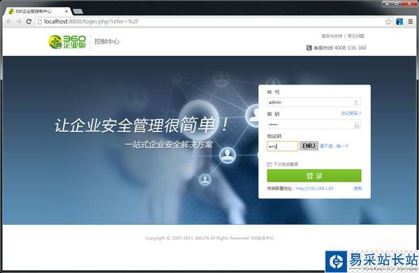 在 開始->程序->360企業(yè)版控制中心,打開“360企業(yè)版控制中心”,出現(xiàn)如下界面:(注:帳號密碼都是admin)