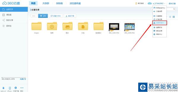 第六步:拿到升級卡密碼后登錄360云盤點擊自己的帳號:“選擇空間卡升級”