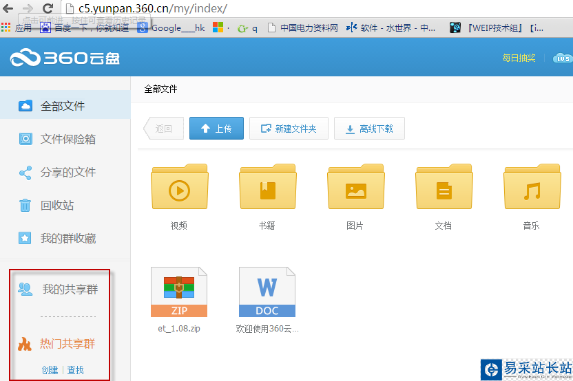 3、進入我的360云盤,可以看到左側有我的共享群,熱門共享群等: