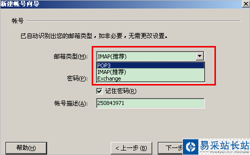 2、選擇郵箱帳號類型是:pop、imap或exchange;
