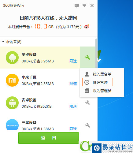進入后,用戶就可以查看到所有接入360隨身wifi的用戶,如果想限制某個用戶的速度,可以點擊用戶旁的“限速”按鈕,展開列表,選擇“限速管理”。