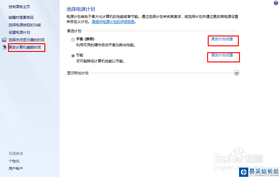 打開“電源選項”設置,我們能看到電腦有兩個模式,點擊選擇現在已選擇的模式后的“更改計劃設置”