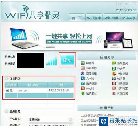 打開筆記本的無線網卡開關(請根據自己的機型查找開關位置),修改好wifi賬戶名跟密碼后就可以點擊啟動了,稍等片刻會提示成功,wifi熱點就成功建立了。
