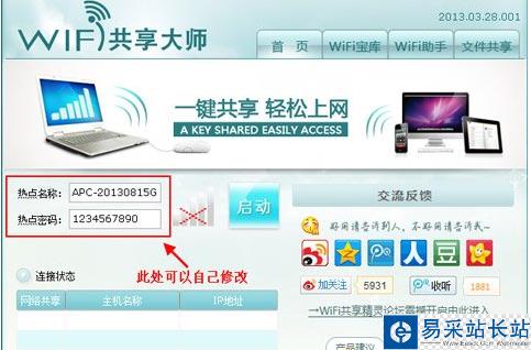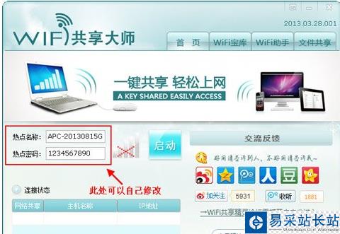 打開wifi共享精靈之后可以看到軟件首頁有個熱點名稱及密碼的欄,這里是軟件默認的wifi賬號及密碼,我們可以自己修改。