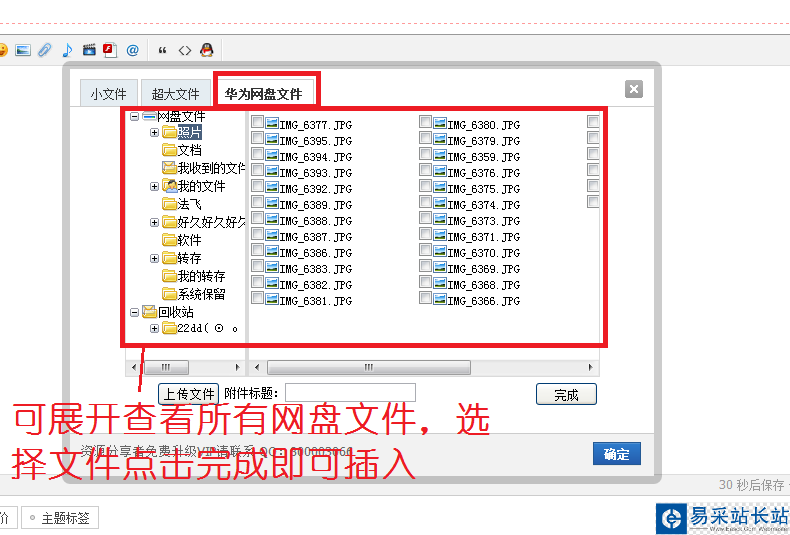 2.1 使用“華為網盤文件”,論壇用戶登錄華為網盤后,可以直接從個人網盤里選擇文件插入,如圖: