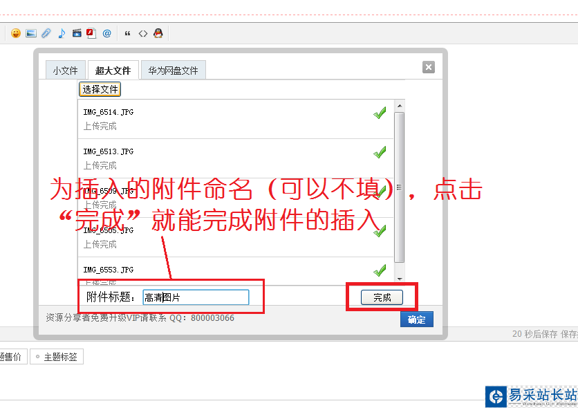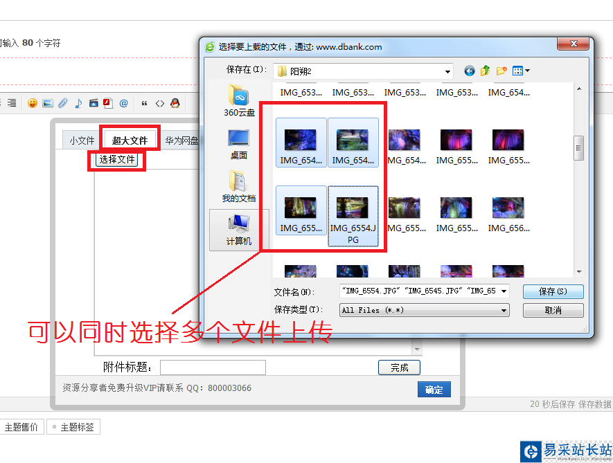 1.1 成功安裝附件伴侶后,點擊論壇插件按鈕可看到“超大文件”和“華為網盤文件”標簽,使用“超大文件”論壇用戶不需要登錄華為網盤,可直接從本地電腦選擇文件上傳至論壇,如圖: