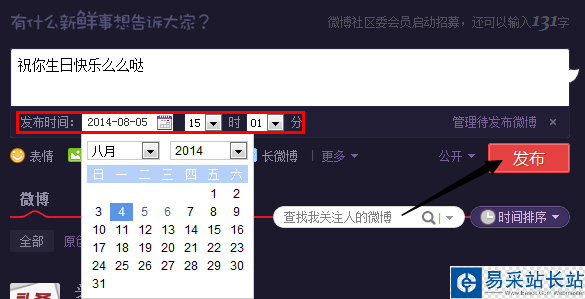 3、輸入自己的內容,并設置發布時間,點擊發布即可
