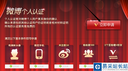 2、接下來出現(xiàn)的頁面便是微博個人認證需滿足的基本條件,若都滿足,便點立即申請,如圖