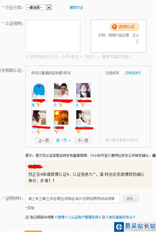 5、選擇行業(yè)分類,填寫認證說明,并選擇好友幫忙進行認證,最后上傳材料證明,點擊提交,即可在24小時內(nèi)得到官方答復(fù)。