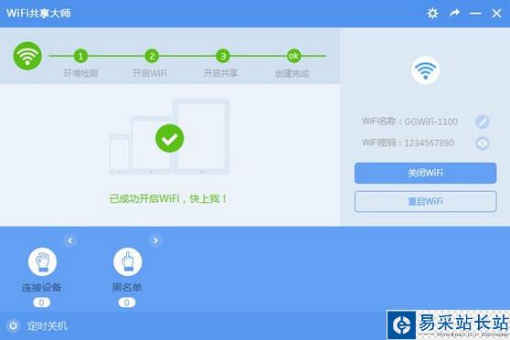 WiFi共享大師安裝完畢之后會自動打開,這時,你只需要點擊“立即開啟WiFi”的按鈕就可以使用了。創建完成之后,就可以用手機搜索無線網,然后上網沖浪了。