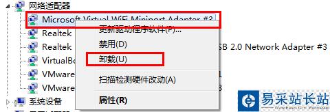 在設備管理器的網絡適配器中,右擊卸載Microsoft Virtual WiFi Miniport Adapter,然后再重新用WiFi共享大師創建一下。這里有個需要注意的是,Microsoft Virtual WiFi Miniport Adapter要在WiFi熱點創建了之后才出現,所以進行這步操作的時候,要先將WiFi共享大師創建好。