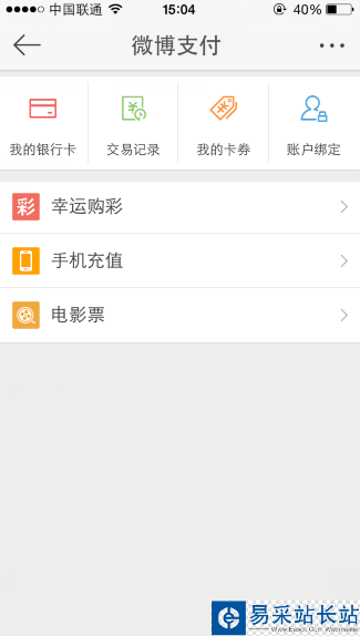 大家可以點擊最下方的幸運購彩、手機充值、電影票,這三種算是微博支付目前所合作的,畢竟微博支付沒有支付寶那么強大,點擊自己想要購買的東西,使用銀行卡或支付寶付賬即可完成微博支付。