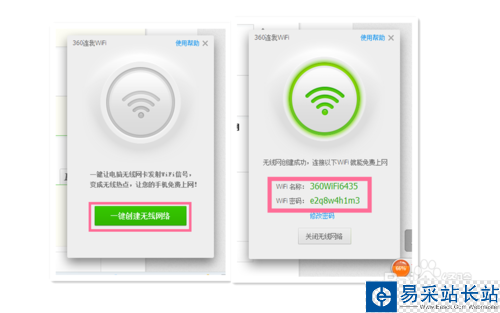 在彈出的360連我wife界面點擊《一鍵創建無線網絡》,這時等待360自動創建無線網絡,創建成功后,根據360連我wife提供的賬號密碼,你就可以連接無線網絡使用了。