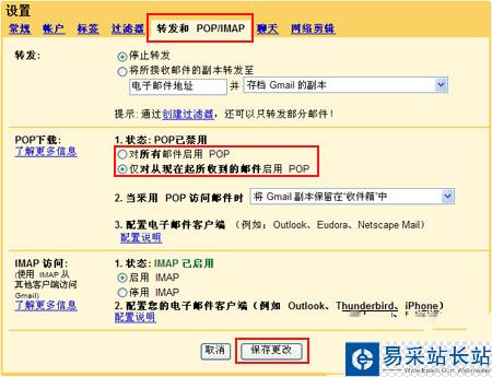 3、選擇后,請(qǐng)點(diǎn)擊“保存更改”。這樣就成功開啟Gmail的POP服務(wù)了。