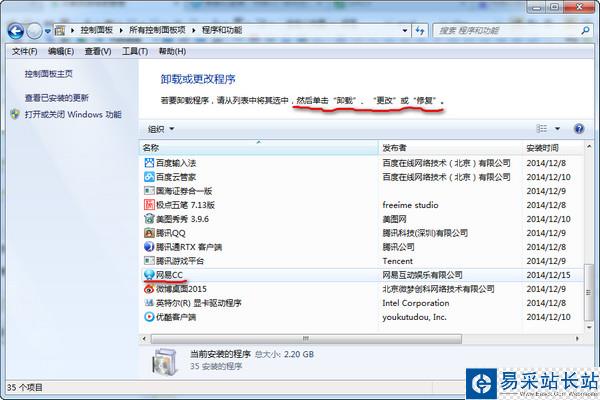 3、還有一種就是進系統程序管理里面進行卸載:進控制面板—找到“程序和功能”—找到網易CC,在圖標上右鍵即可卸載