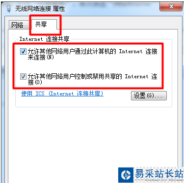 步驟四:并在打開的“無線網(wǎng)絡(luò)屬性”窗口中切換至“共享”選項(xiàng)卡,勾選兩個(gè)選項(xiàng),最后點(diǎn)擊“確定”完成設(shè)置。
