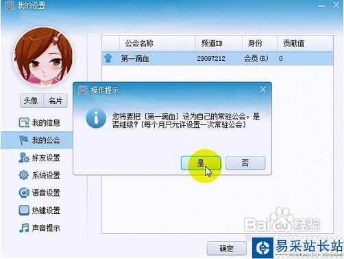 步驟四:單擊“設置常駐公會”后會彈出一個讓你確認是否將XX公會設置為常駐公會的提示框,如下圖所示,然后選擇“是”這個選項。