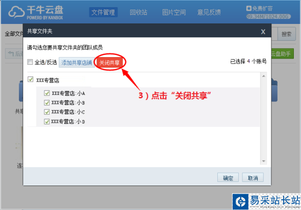 選中要關閉共享的文件夾,“內部共享”-“關閉共享”即可。
