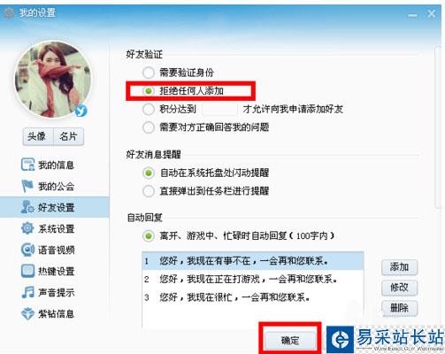 步驟二:在彈出的對話框中選擇“好友設置”點擊“拒絕任何人添加”點擊確定。