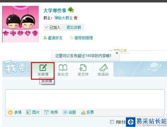 步驟四:由于只能在加入的微群里發(fā)微博,進(jìn)入之后可以點(diǎn)擊發(fā)布微博按鈕,在微博框中輸入你想輸入的文字,這里跟發(fā)布常規(guī)微博一樣,可以插入圖片,編輯之后點(diǎn)擊發(fā)布即可,如圖所示。