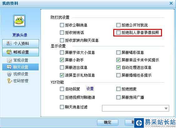 在聊天室中娛樂時,如果您不想讓其他人對您錄音、錄像、拍照,您可以在“主菜單”中點擊“個人設置”,然后選擇“拒絕別人錄音錄像拍照”,點擊確認即可。下圖: