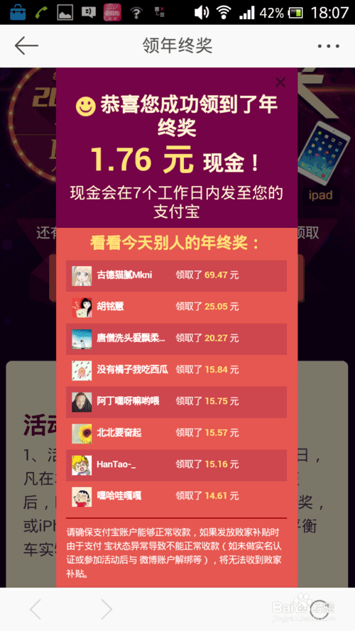 支付成功后,你返回后就是提示你抽中了多少..(小編年終獎抽到1.43)