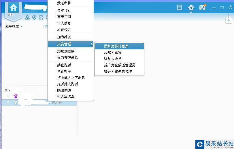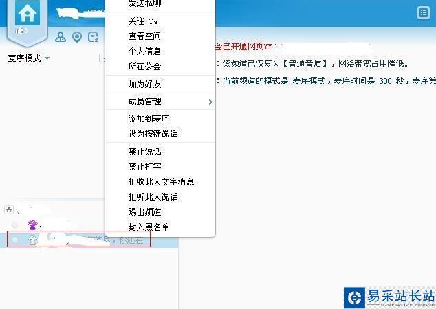 3、假如你是要給你自己的會員添加馬甲的話,那我們可以先進入YY頻道,然后點擊自己要加馬甲的昵稱,選上之后單擊右鍵