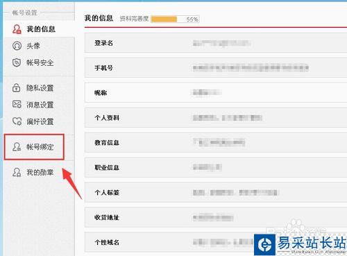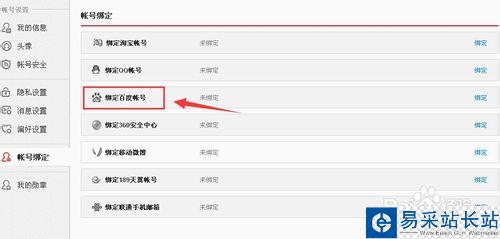來到賬號設置我的信息頁面,再點擊左側菜單列表中的”賬號綁定“。(如下圖)