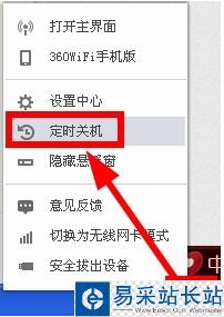 2、然后我們將鼠標放在任務欄的360隨身WiFi處右擊,就會出現一個菜單選擇“定時關機”