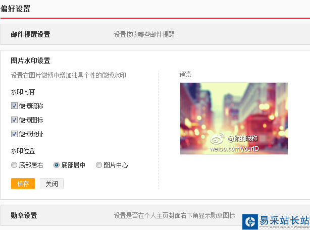 3、可以在出現的“圖片水印設置”中選擇“微博昵稱、微博圖標、微博地址”等水印內容,也可以更改水印位置。同時在右側可以看到修改后的效果。最后不要忘了點擊保存哦!在這里水印底部居右就是大家最常見的效果,底部居中就是下圖的顯示效果圖,而圖片中心就是在圖片的正中央,大家喜歡將水印設置在哪里都可以哦!