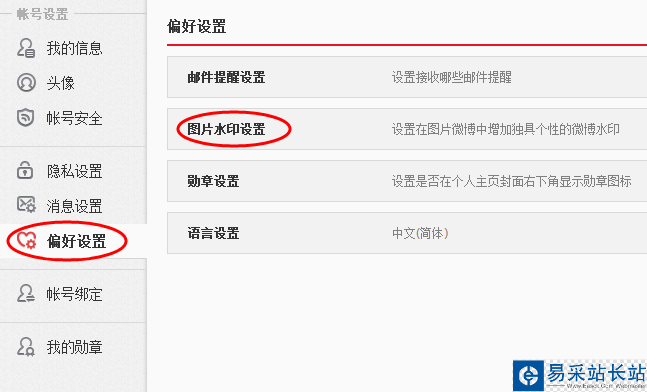 2、在出現的賬號設置頁面里,選擇左側的偏好設置,即可看到右側的【圖片水印設置】。