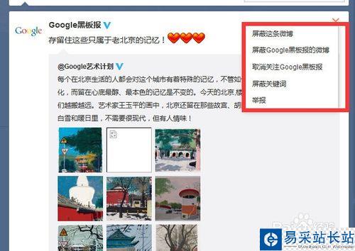另外,還有一種簡便的方法。當用戶的微博出現在你的首頁的時候,點擊微博右側的倒三角形。就可以屏蔽了。