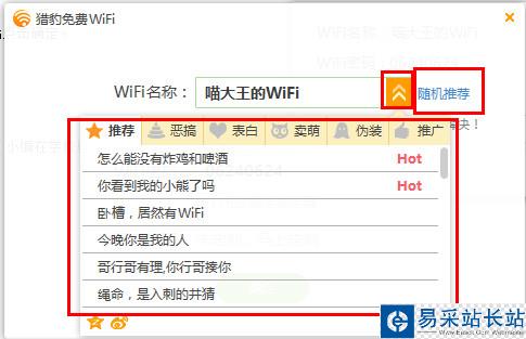 3、可以點擊wifi名稱框旁邊的下拉按鈕選擇你自己喜歡的,也可以點擊旁邊的隨機推薦讓電腦為你選出一些熱門的