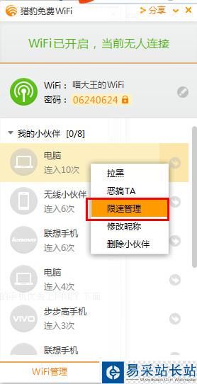 2、然后我們看到連接我們手機的wifi列表,右擊連接設(shè)備,選擇“限速管理”,