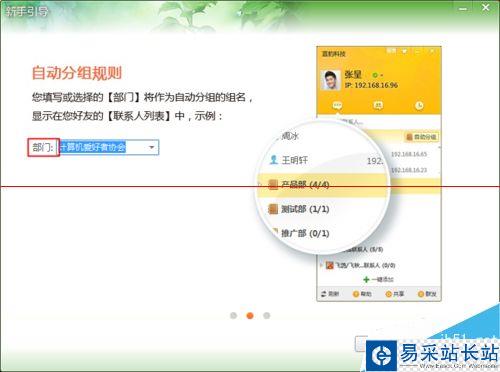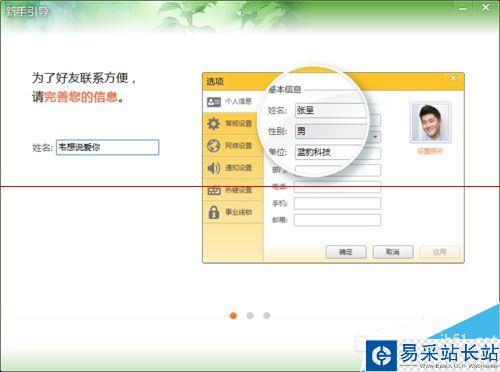 1、安裝時運行向導就行了,填寫名稱、部門、添加好友等。
