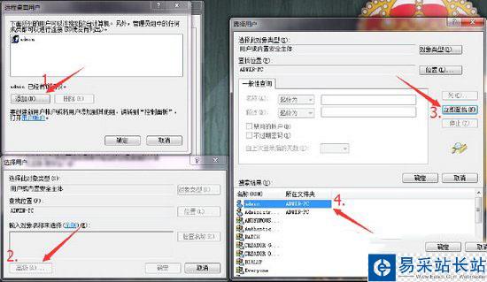 其次,如下圖所示,在選擇用戶界面,點擊“添加”,在“輸入對象名稱來選擇”選框下點擊“高級”,再點擊“立即查找”。在搜索結果中找到自己電腦的用戶名選中,然后確定。