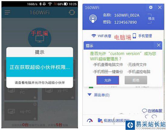 在手機上打開160WiFi,找到自己的電腦用戶名,并請求管理電腦。同時,電腦端的160WiFi會出現是否允許手機管理電腦的提示,點擊允許,即可讓手機成為“超級管理員”。