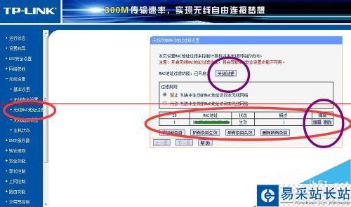 4、看到圖中狹長(zhǎng)狀的紅圈標(biāo)示的那條信息了吧,那就是被列入黑名單的設(shè)備的MAC地址了,點(diǎn)擊最右側(cè)紫色圈中的"刪除",或點(diǎn)擊上邊紫色圈中的“關(guān)閉過(guò)濾按鈕”,然后關(guān)閉瀏覽器頁(yè)面。