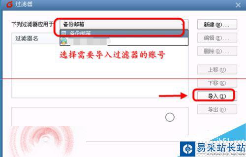 1、把備份好導出的過濾器規則,拷貝到需要導入的foxmail客戶端電腦。同樣點擊右上方---選項---過濾器。 選擇需要導入過濾器規則的賬號,然后點擊【導入】