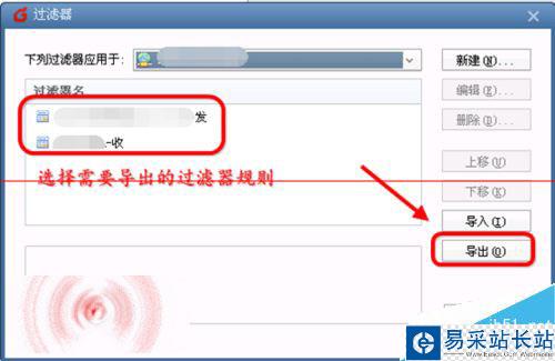 2、注意如果有多個賬號的時候,要看下過濾器應用的賬號。選中需要導出的過濾器規則點擊【導出】