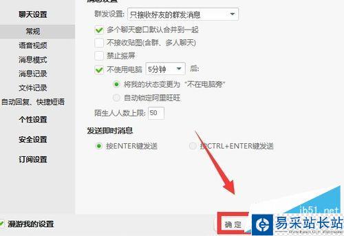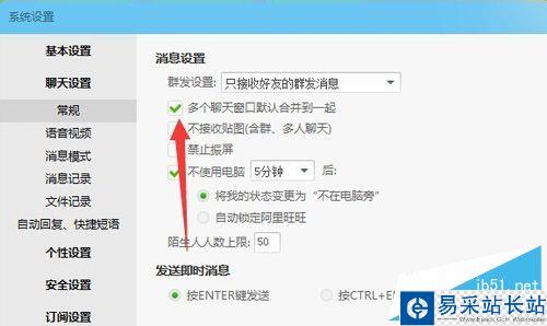 5、在聊天設置的右側選擇多個聊天窗口默認合并在一起,前面的小方框打對號。