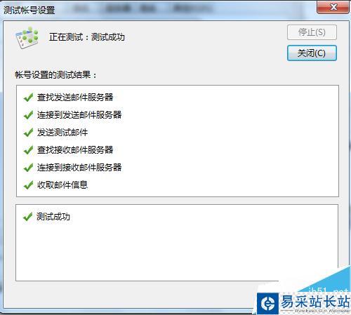 7、測試程序會發(fā)送一封測試郵件到服務(wù)器再返回本地,如果服務(wù)器設(shè)置無誤即可通過測試,如果無法測試應(yīng)該到網(wǎng)頁版郵箱賬戶的設(shè)置查看服務(wù)器IP地址。