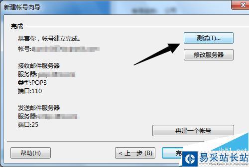 6、根據(jù)郵箱的類型不同,可能自動設(shè)置郵件收發(fā)服務(wù)不一定正確,因此建議你點擊配置窗口右上角的【測試】,檢查收發(fā)服務(wù)器是否設(shè)置正常。