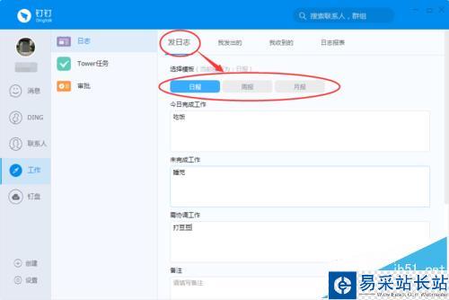 3、編輯日志,釘釘中的日志目前有三種類型,日報、周報和月報。