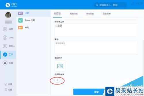 4、選擇一種日志類型按照格式內(nèi)容進(jìn)行填寫,填寫完畢后準(zhǔn)備發(fā)出,點擊“”選擇群會話“,再”選擇會話“對話框中可以輸入群名或者人員名稱進(jìn)行搜索,也可以選擇最近聯(lián)系人(群)。