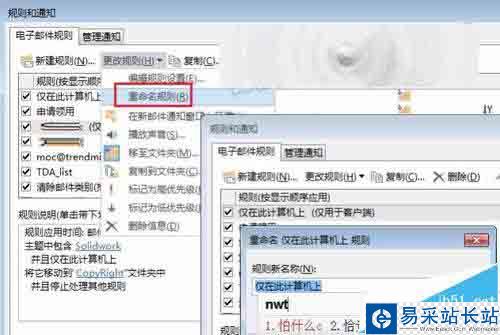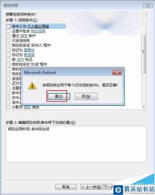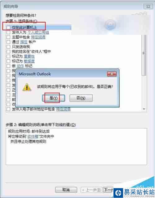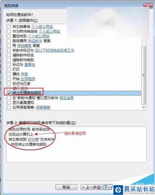 12、還有最后一個關鍵點,將所有其它規則(可以除了通知和清除類規則外)都重新設置一個“停止處理其它規則的”選項,否則依然會執行“收件箱”這條規則從而接收到重復的郵件: