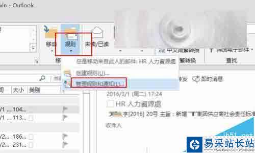 1、先點擊“規則”按鈕,再選擇“管理規則和通知”: